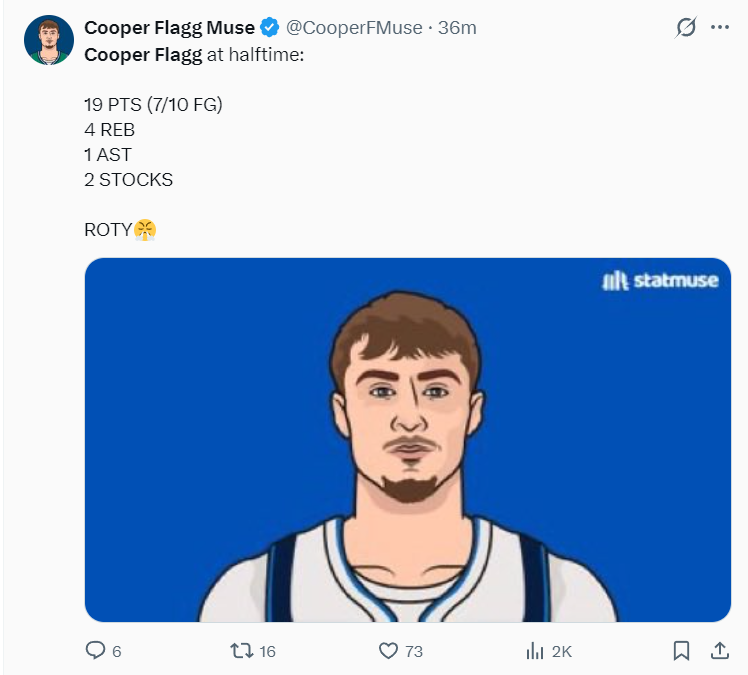 次节弗拉格更为爆炸,单节5中5+罚球2中2,各种高难度的后仰跳投命中,单节12分4篮板1助攻1盖帽,半场弗拉格17分钟,10中7+三分1中1,拿到19分4篮板1助攻1抢断1盖帽,独行侠媒体盛赞最佳新秀。